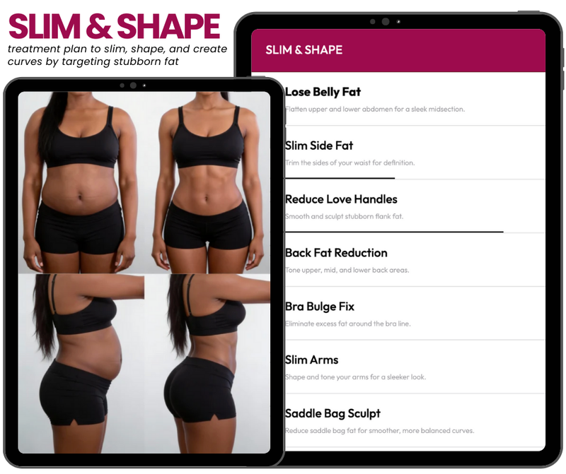 This treatment plan is designed to help you slim down trouble areas, sculpt your waist, lift and shape glutes, and create natural, feminine curves — all while improving overall body composition and guiding you with step-by-step routines, holistic strategies, and optional med spa or minimally invasive solutions.