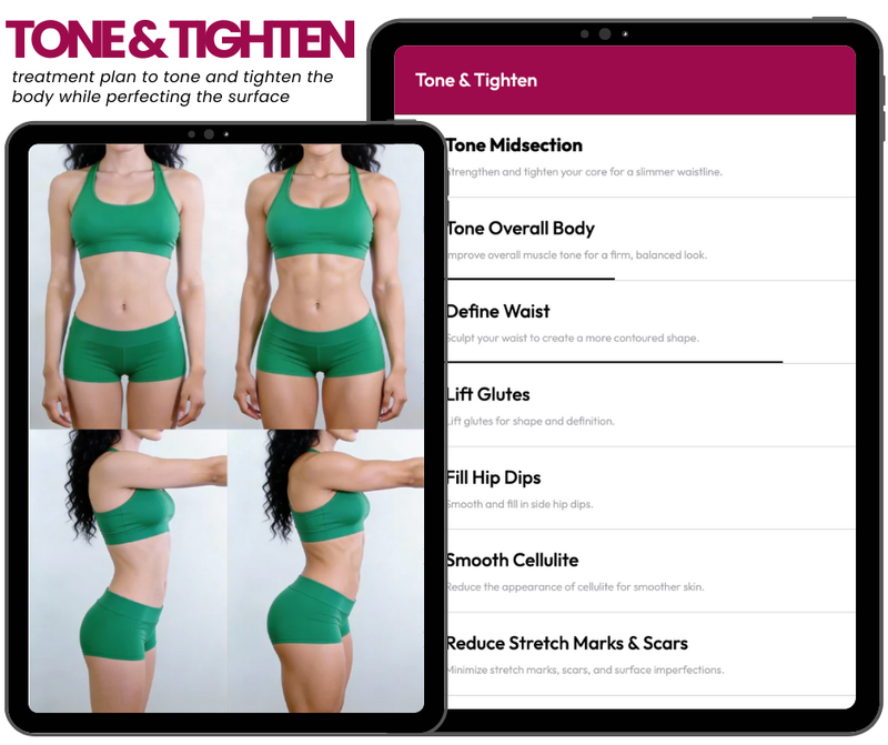 This treatment plan is designed to tone muscles, tighten loose skin, smooth cellulite, lift glutes, and refine your body’s appearance, with step-by-step routines, holistic strategies, and optional med spa or minimally invasive solutions to help you feel confident and polished from every angle.